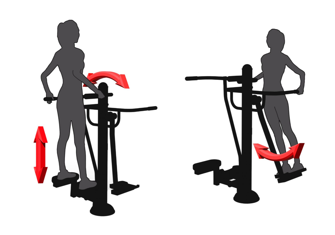 Pevně uchopte držadla a postavte se na pedály. Jednu nohu zatlačte dolů tak, aby byla vystřená. Současně druhou zvedněte nahoru tak, aby bylo koleno ohnuté. Rukama tlačte tyče nahoru a dolů. Provádějte plynulé a kontrolované pohyby. Počet opakování zvyšujte podle zlepšení kondice.
