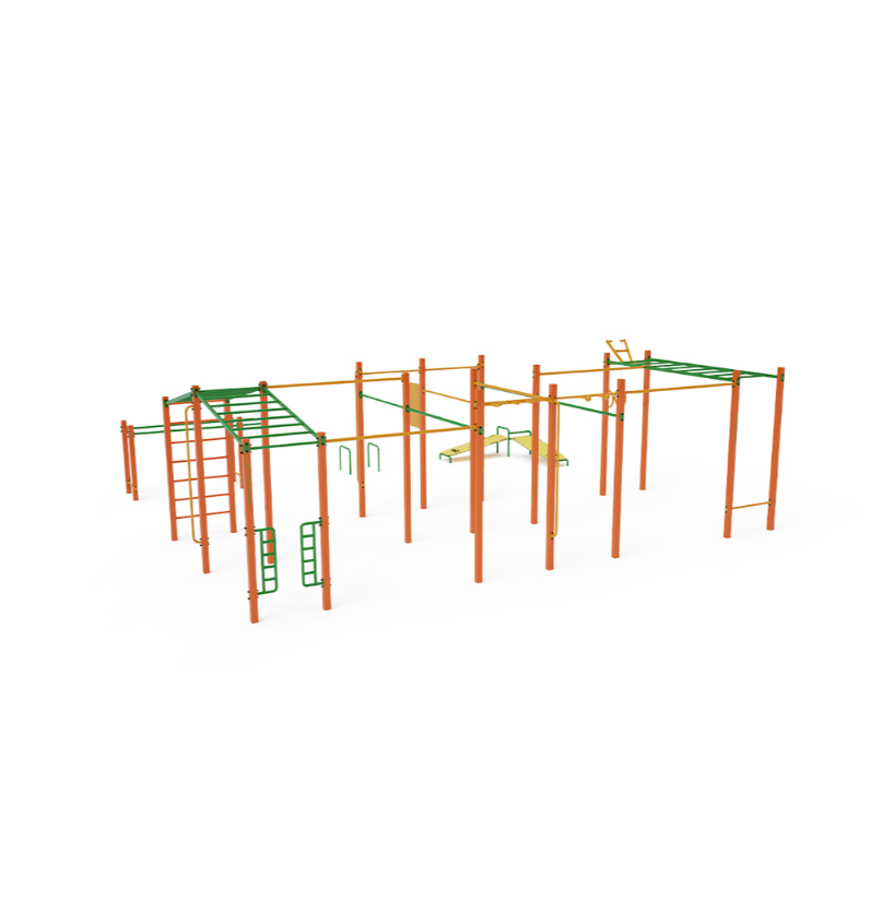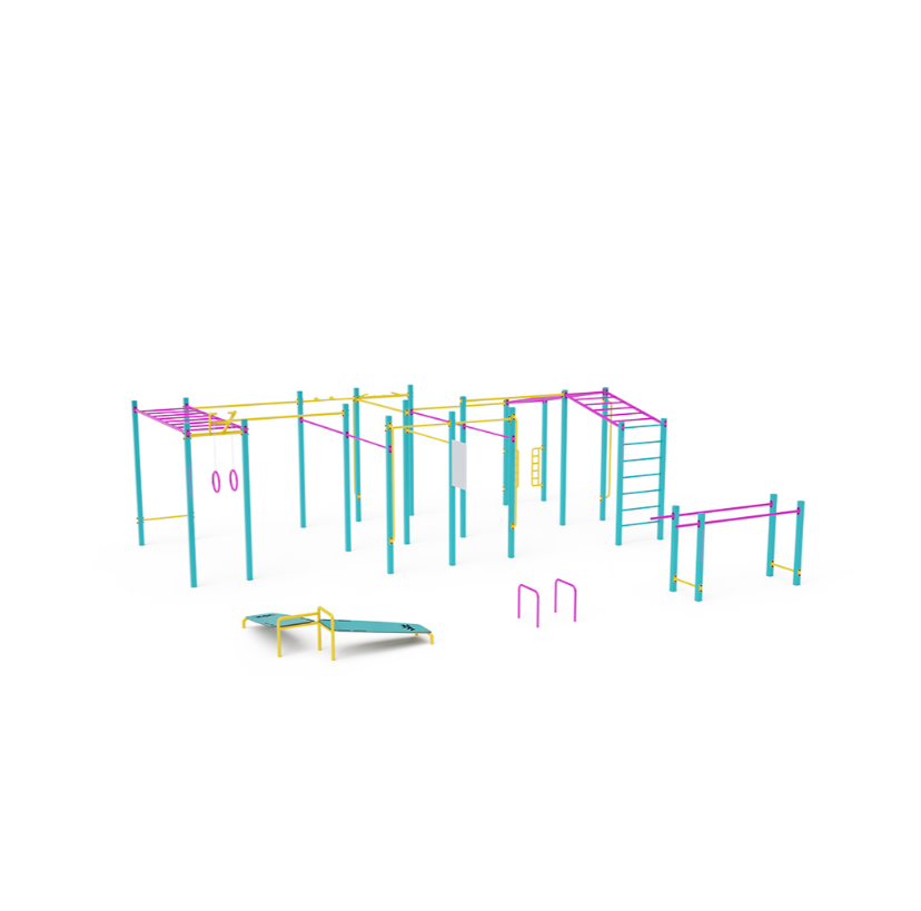 Workout je stále populárnější způsob cvičení v exteriéru, při kterém se využívá hlavně hmotnost vlastního těla. Cvičení je pestré díky prostředí na čerstvém vzduchu a široké škále cviků, které workoutové prvky a sestavy umožňují. Prospívá tak nejen fyzické, ale také psychické pohodě. Středně velká sestava s více různě vysokými hrazdami, žebříky a žebřinami a kruhy je doplněna dvěma samostatně stojícími bradly a dvěma leh – sedmi.