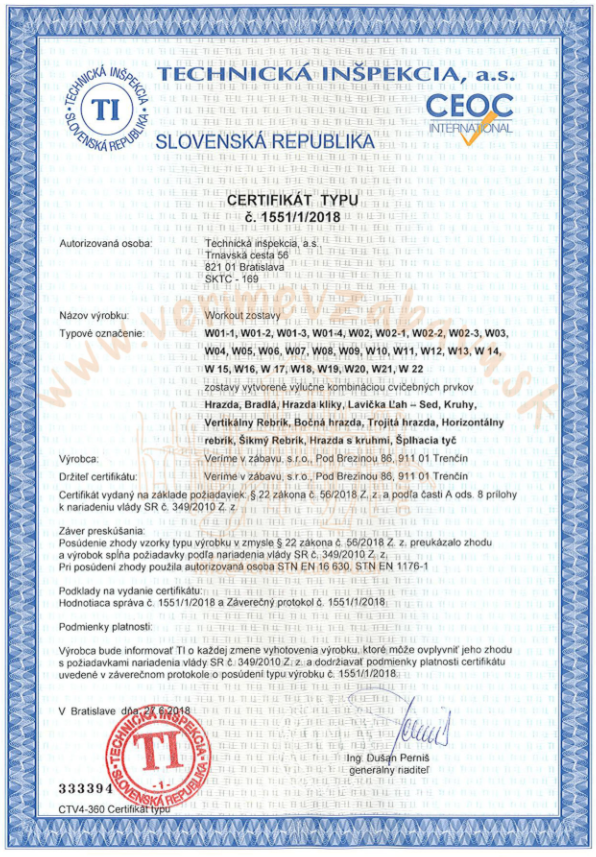 Street workout sestava W10-1 je certifikována dle ČSN EN 16 630