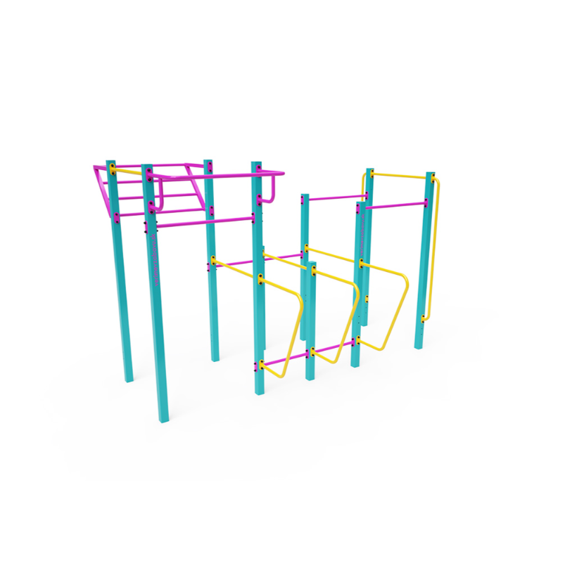 Workout je stále populárnější způsob cvičení v exteriéru, při kterém se využívá hlavně hmotnost vlastního těla. Cvičení je pestré díky prostředí na čerstvém vzduchu a široké škále cviků, které workoutové prvky a sestavy umožňují. Prospívá tak nejen fyzické, ale také psychické pohodě. Středně velká sestava s několika horizontálními hrazdami různé výšky, vertikálními hrazdami, nakloněnou žebřinou je doplněna dvěma dvojitými bradly a vysunutou hrazdou.