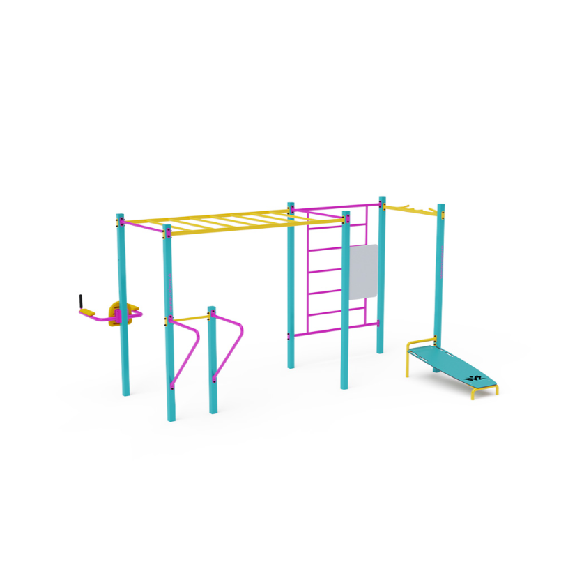 Workout je stále populárnější způsob cvičení v exteriéru, při kterém se využívá hlavně hmotnost vlastního těla. Cvičení je pestré díky prostředí na čerstvém vzduchu a široké škále cviků, které workoutové prvky a sestavy umožňují. Prospívá tak nejen fyzické, ale také psychické pohodě. Menší sestava s hrazdou, horizontálním a vertikálním žebříkem, bradly a posilovací lavičkou leh-sed a posilovačem břišních svalů.