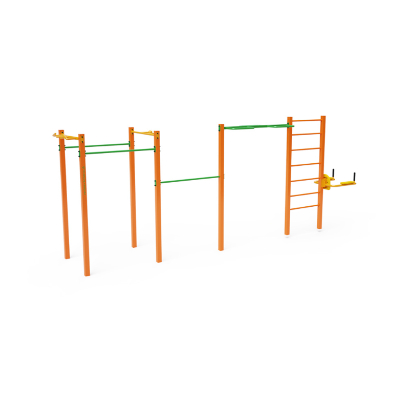 Workout je stále populárnější způsob cvičení v exteriéru, při kterém se využívá hlavně hmotnost vlastního těla. Cvičení je pestré díky prostředí na čerstvém vzduchu a široké škále cviků, které workoutové prvky a sestavy umožňují. Prospívá tak nejen fyzické, ale také psychické pohodě. Menší sestava s více horizontálními hrazdami různé výšky, vertikálním žebříkem, posilovačem břišních svalů, hrazdou s koulemi a multi úchopovou hrazdou a klenutou hrazdou.