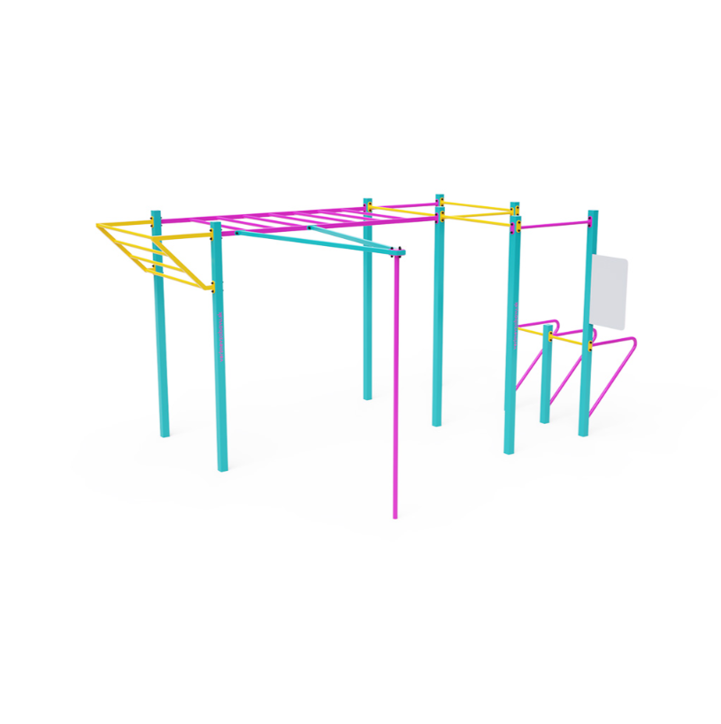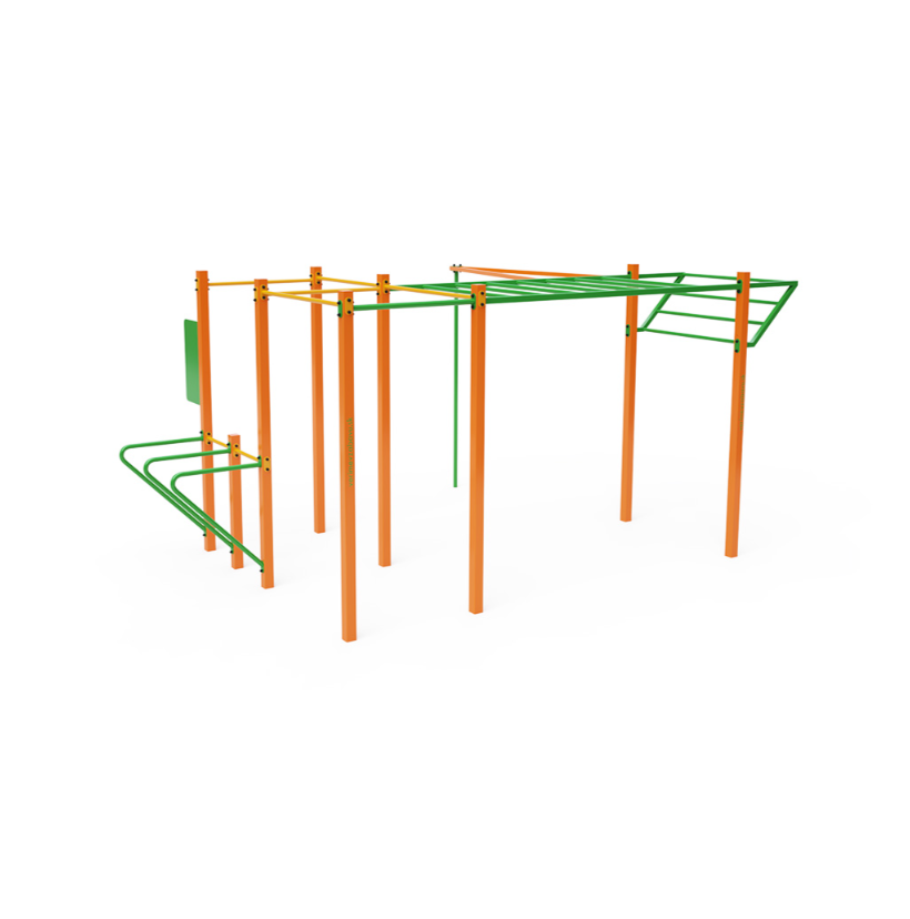 Workout je stále populárnější způsob cvičení v exteriéru, při kterém se využívá hlavně hmotnost vlastního těla. Cvičení je pestré díky prostředí na čerstvém vzduchu a široké škále cviků, které workoutové prvky a sestavy umožňují. Prospívá tak nejen fyzické, ale také psychické po-hodě. Středně velká sestava s více horizontálními hrazdami, bradly, horizontálním žebříkem je doplněna nakloněnou žebřinou a pole dance tyčí.