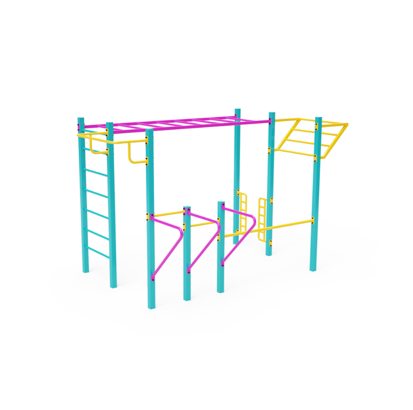 Středně velká sestava s více horizontálními hrazdami, bradly, horizontálním žebříkem je doplněna nakloněnou žebřinou a pole dance tyčí.