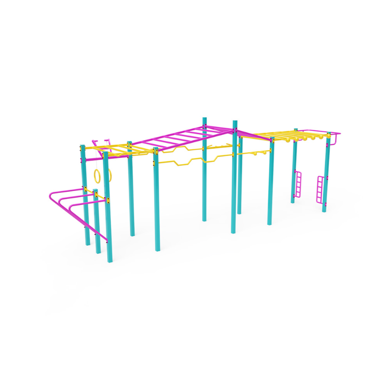 Velká sestava s horizontálními hrazdami různých konfigurací, bradly a horizontálními žebříky je doplněna kruhy a žebřinou na kliky.