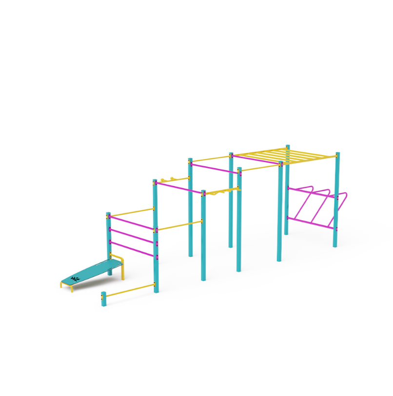 Velká sestava s horizontálními hrazdami různých výšek, vertikálními hrazdami, bradly, horizontálním a žebříkem je doplněna hrazdou s koulemi, multi úchopovou hrazdou a lavičkou leh-sed.