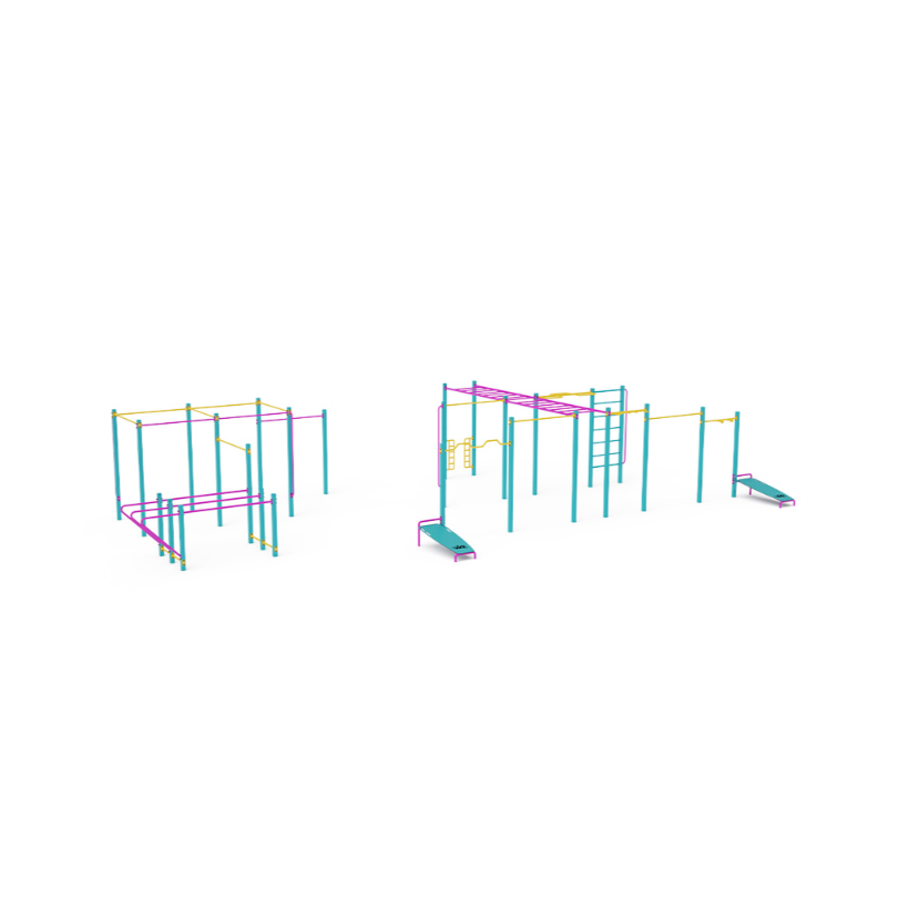 Velká sestava s horizontálními hrazdami různých výšek, vertikálními hrazdami, bradly, horizontálním a vertikálním žebříkem je doplněna hrazdou s půlkruhy a dvěma lavičkami leh-sed.
