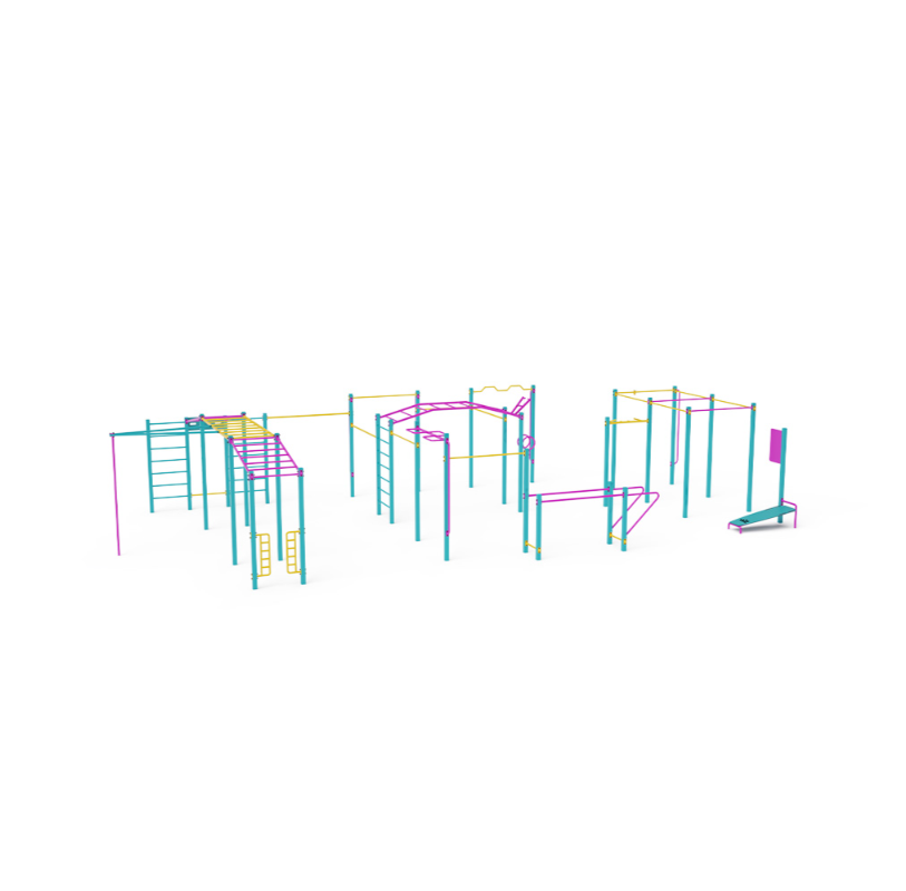 Velká sestava s horizontálními hrazdami různých výšek, vertikálními hrazdami, bradly, horizontálními a vertikálními žebříky je doplněna multi úchopovou hrazdou, multi segmentovou hrazdou, lomenou hrazdou, žebřinou na kliky, kruhy, pole dance tyčí, hangboardem a lavičkou na leh – sed.