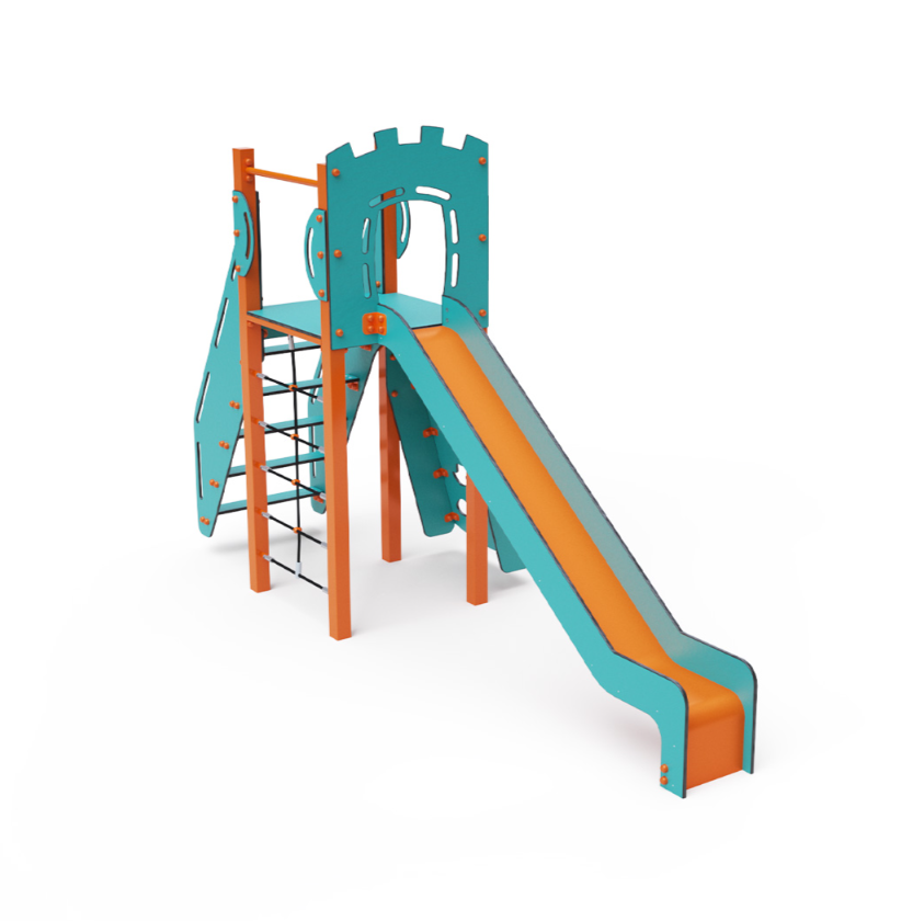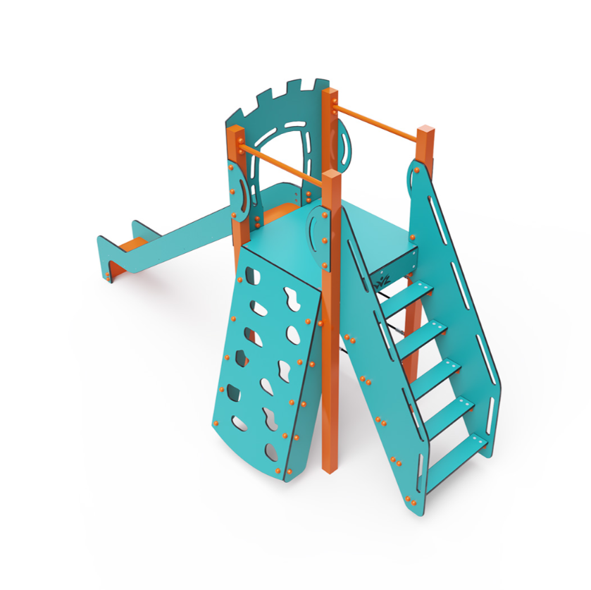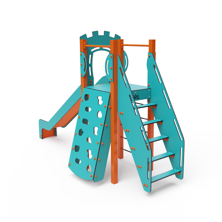 Jednovežová kombinovaná zostava – nízka veža, na ktorú deti vylezú po schodíkoch, šikmej lezeckej stene s úchytmi alebo lanovom výleze a dole sa môžu spustiť po šmykľavke. Tyrkysovo-oranžový dizajn už z diaľky láka k hre. Oceľová konštrukcia je odolná voči poveternostným vplyvom vďaka žiarovému zinkovaniu a lakovaniu odolnou práškovou farbou. Použitý HPL materiál je chemicky odolný, odolný voči UV žiareniu - stálofarebný, netoxický, recyklovateľný a nelámavý. Nehrozí tak poranenie detí ostrými hranami alebo úlomkami. Všetky spoje sú nerezové a zakryté plastovými krytkami na zvýšenie životnosti a bezpečnosti.